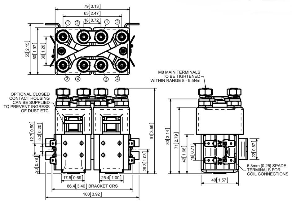 SW822采用双合金主触头,银合金尖端,耐焊接,耐磨,导电性能优异。SW822具有M8螺柱主端子和6.3mm铲形线圈连接。使用提供的支架安装,安装可以是水平或垂直,垂直时M8接触螺柱应指向上方。如果要求是向下定向,我们可以调整接触器以补偿这一点。
